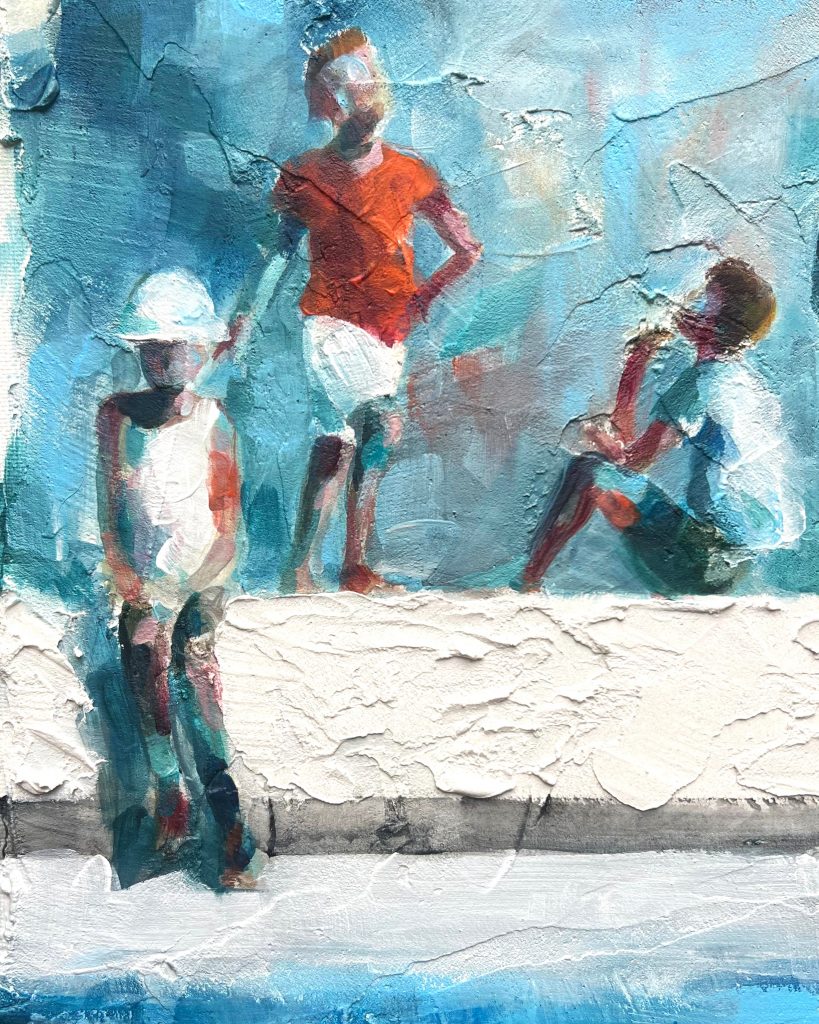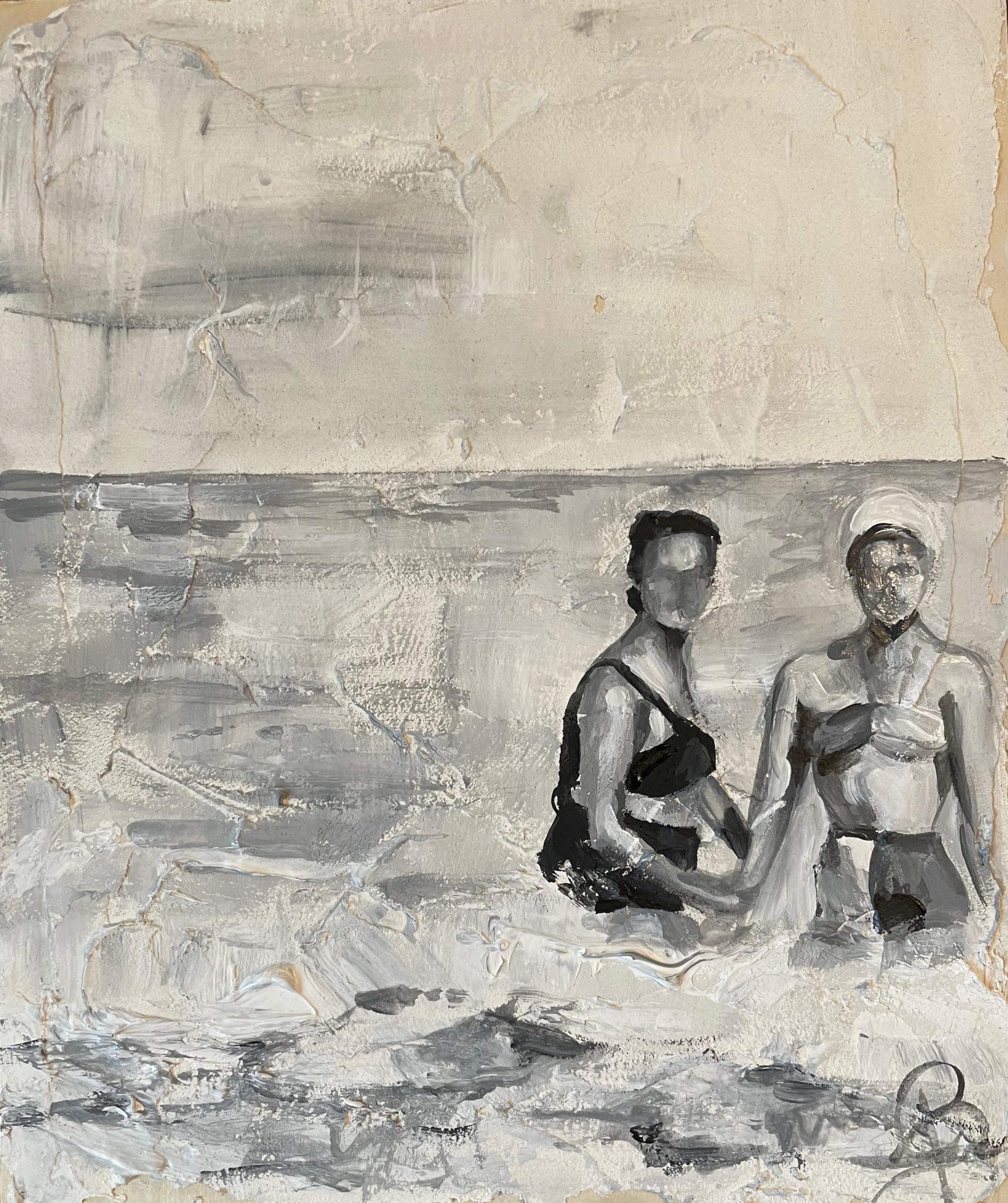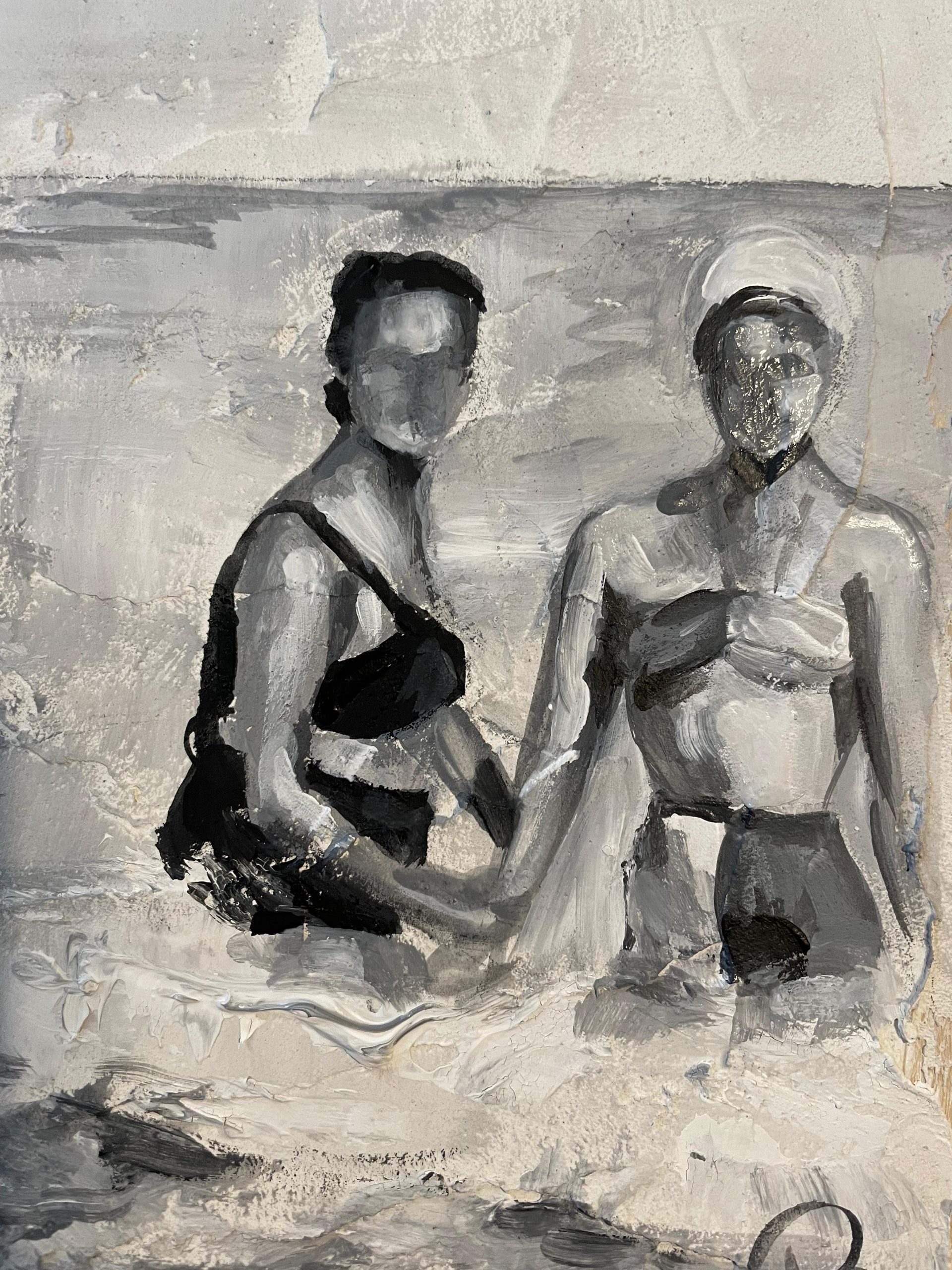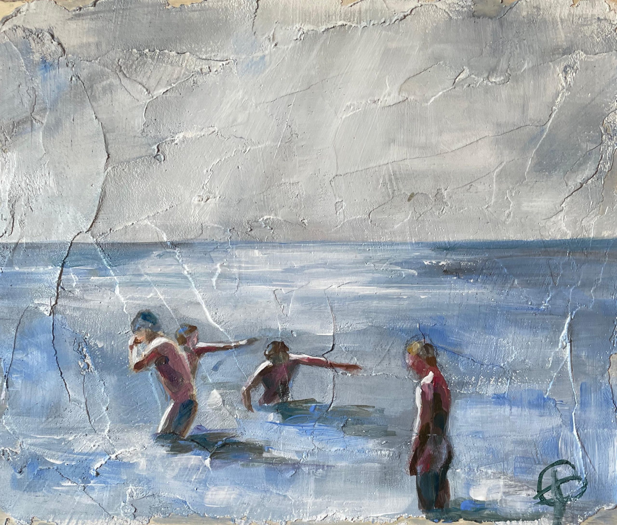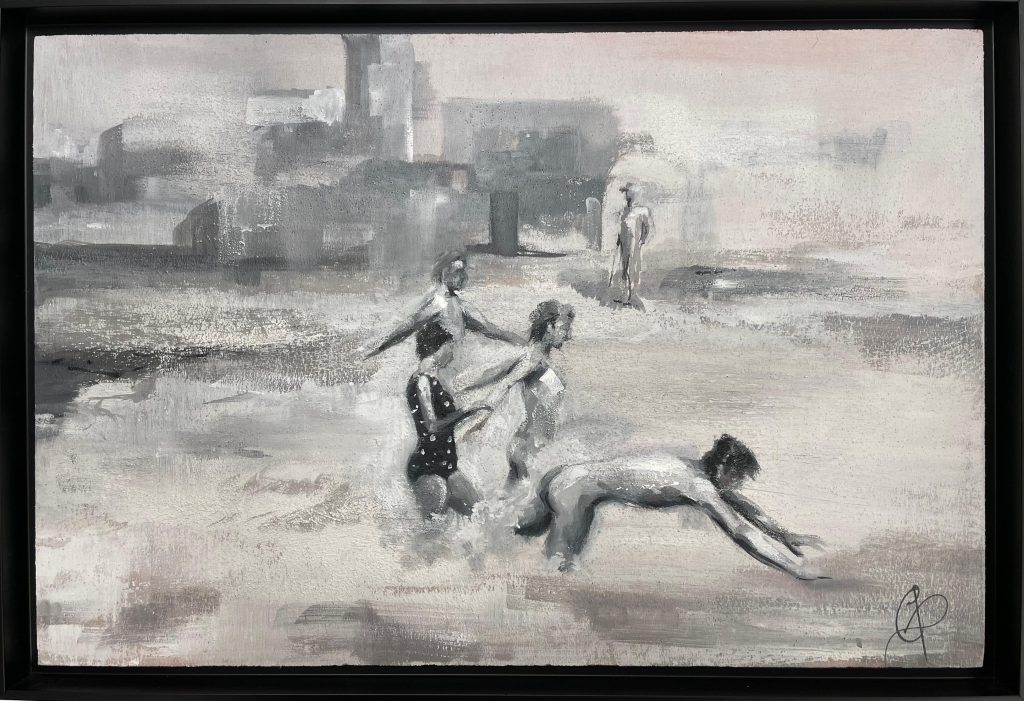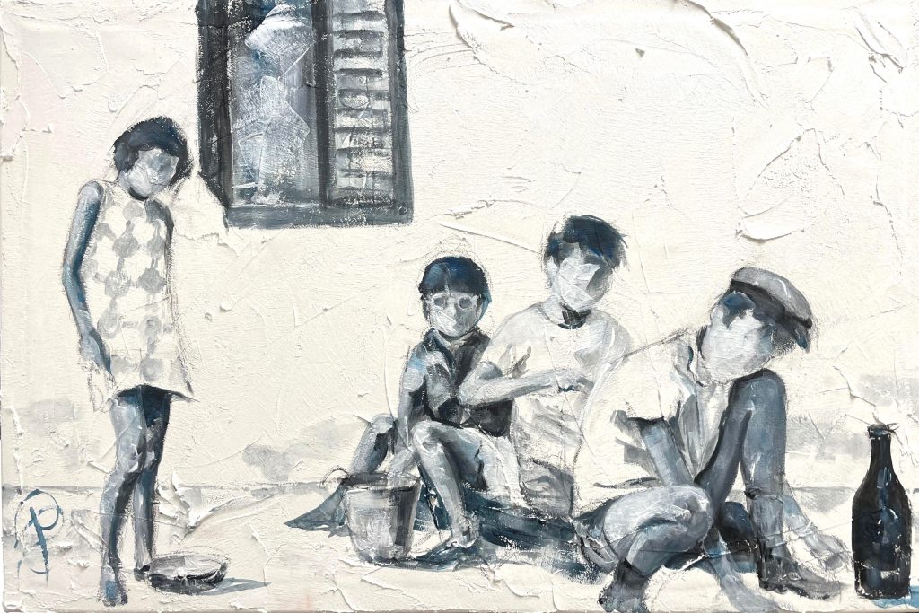 Tutto questo ci rimanda a tempi lontani che hanno una propria armonia intrinseca e che lasciano trasparire modalità espressive che riguardano la gente comune. L’autrice crea con la spatola delle imperfezioni volute che si mischiano agli attimi di spensieratezza evocati e rappresentati in modo peculiare, come i giochi in strada dei bambini o i bagnanti in riva al mare, con una tavolozza scabra e quasi monocroma.