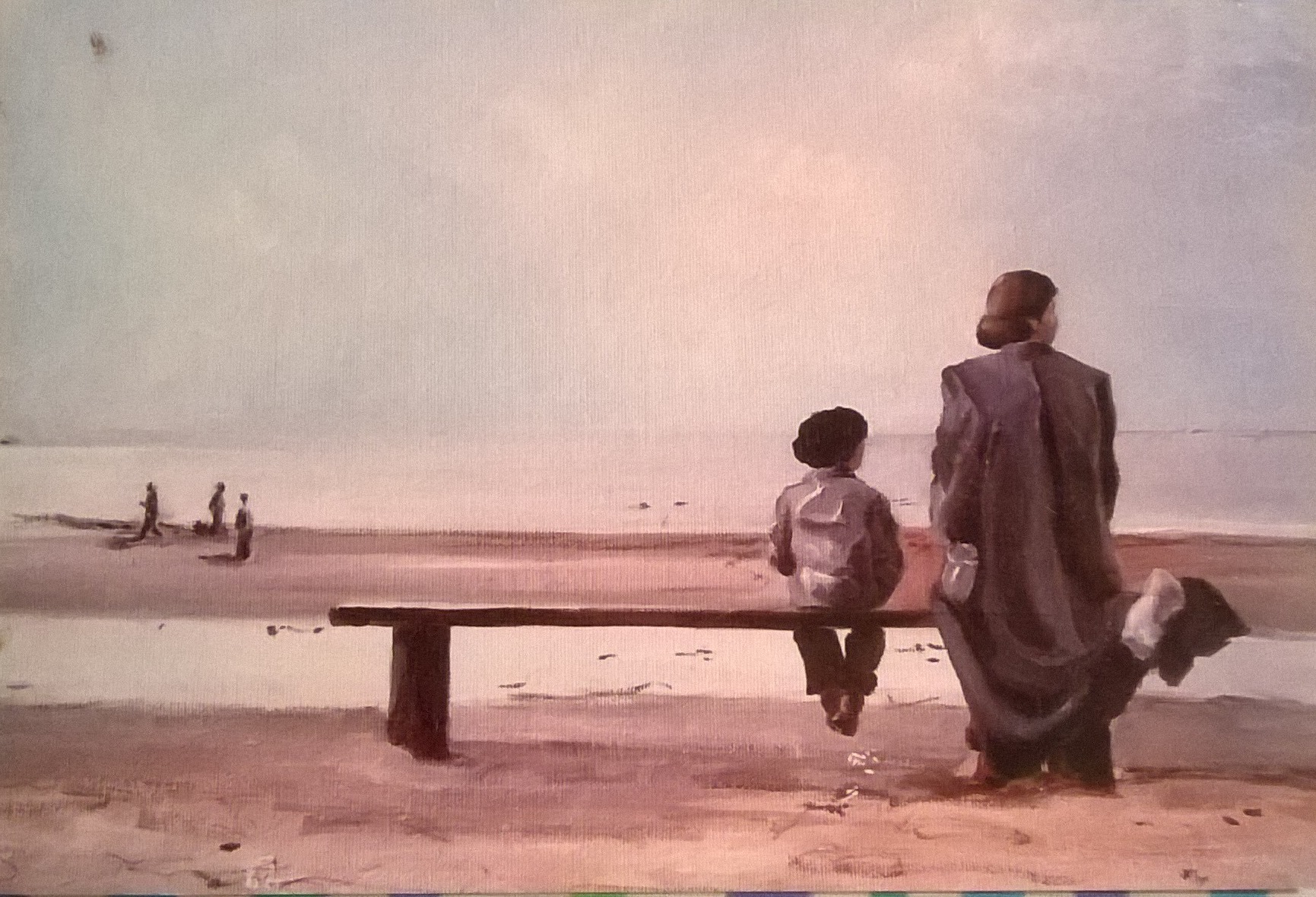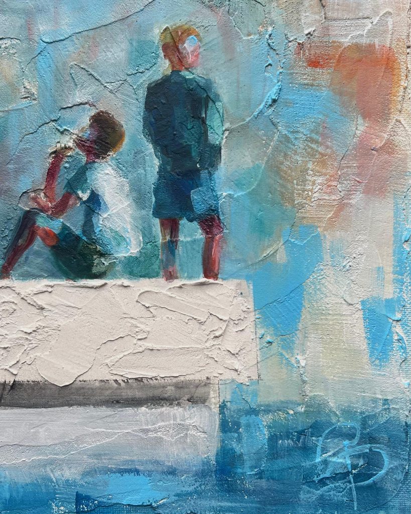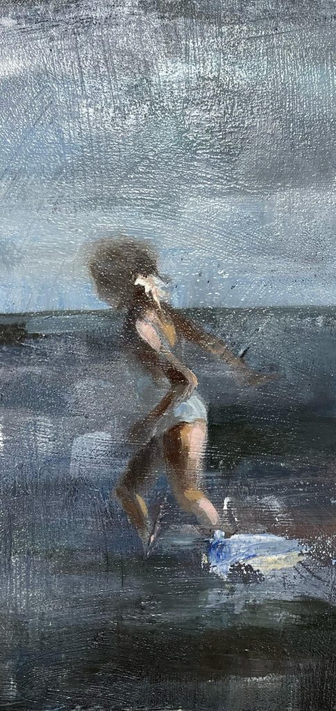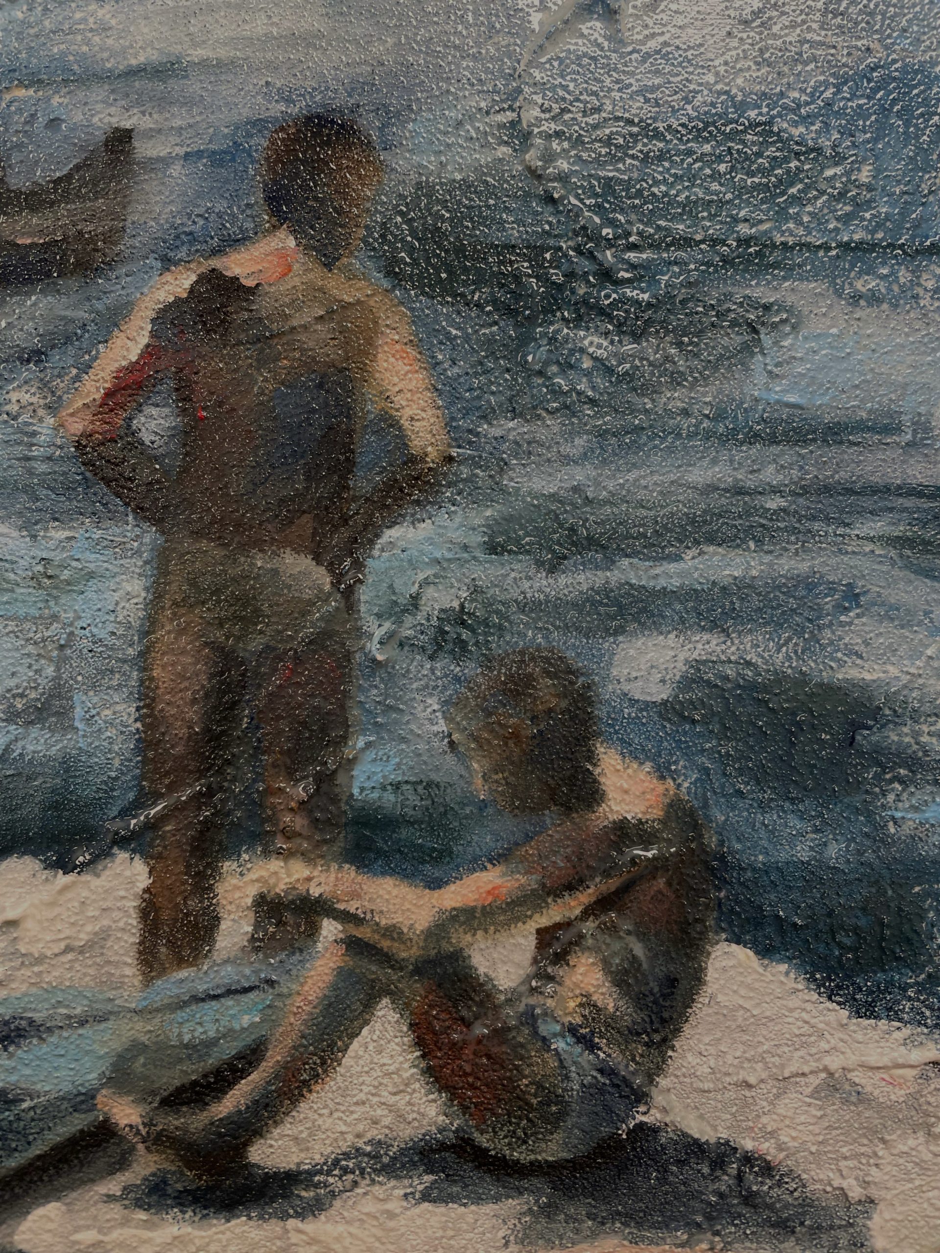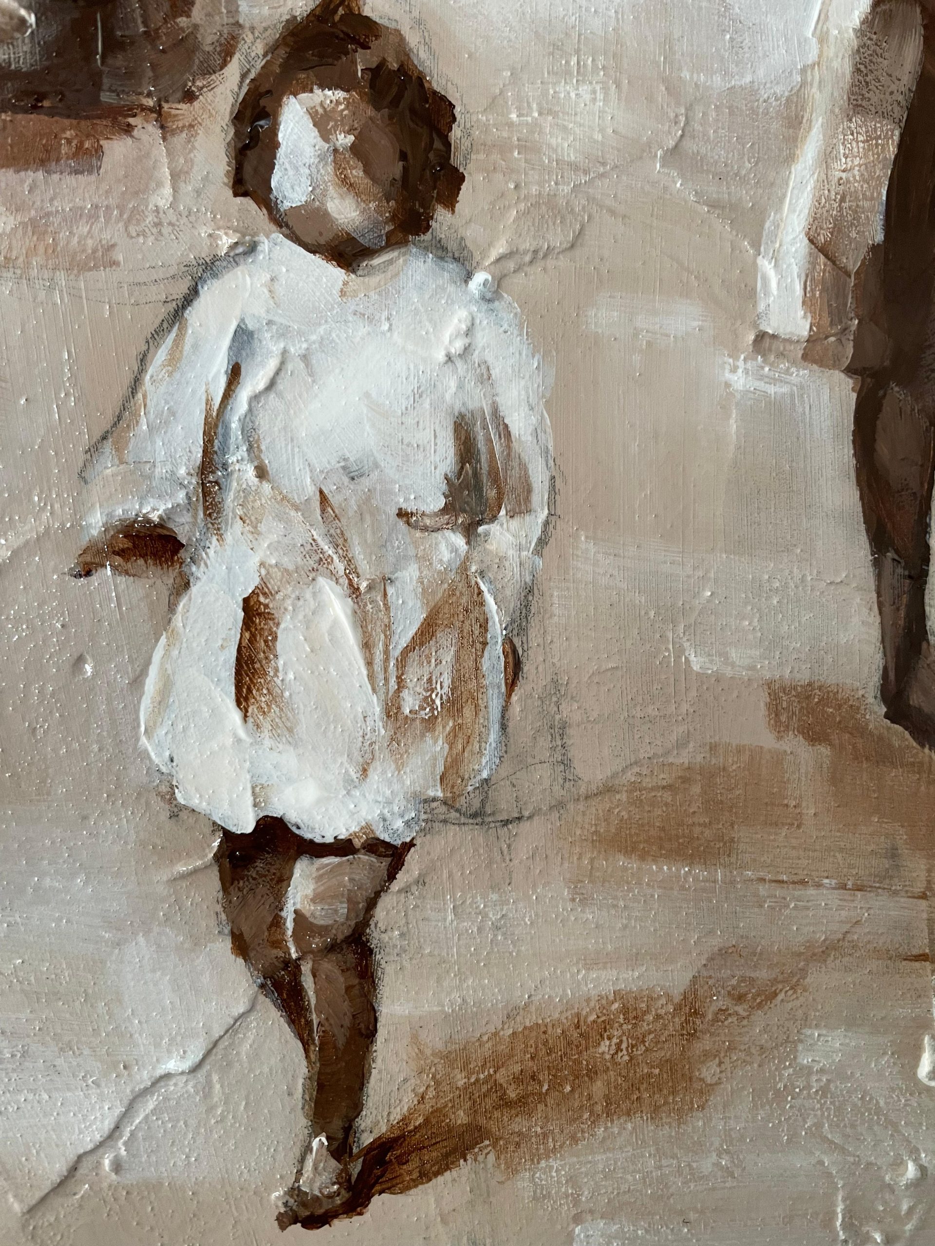 Tutto questo ci rimanda a tempi lontani che hanno una propria armonia intrinseca e che lasciano trasparire modalità espressive che riguardano la gente comune. L’autrice crea con la spatola delle imperfezioni volute che si mischiano agli attimi di spensieratezza evocati e rappresentati in modo peculiare, come i giochi in strada dei bambini o i bagnanti in riva al mare, con una tavolozza scabra e quasi monocroma.