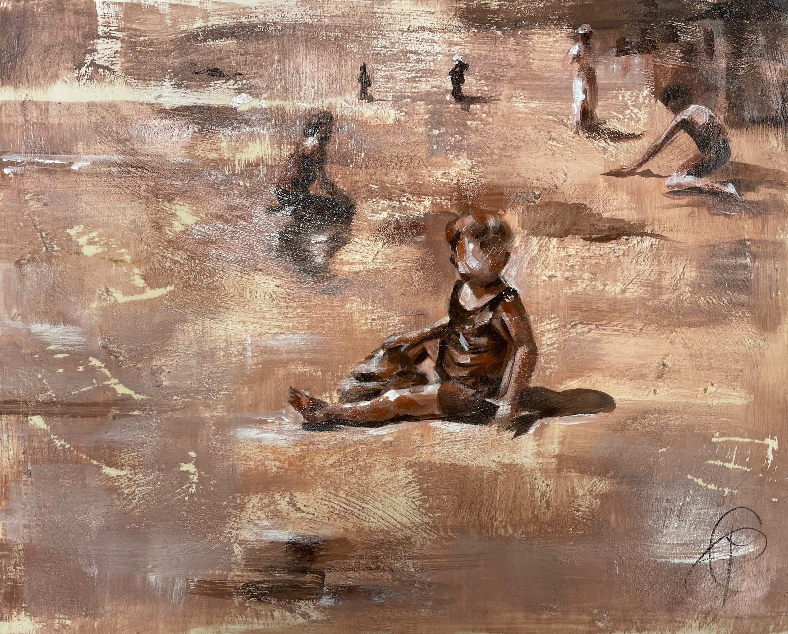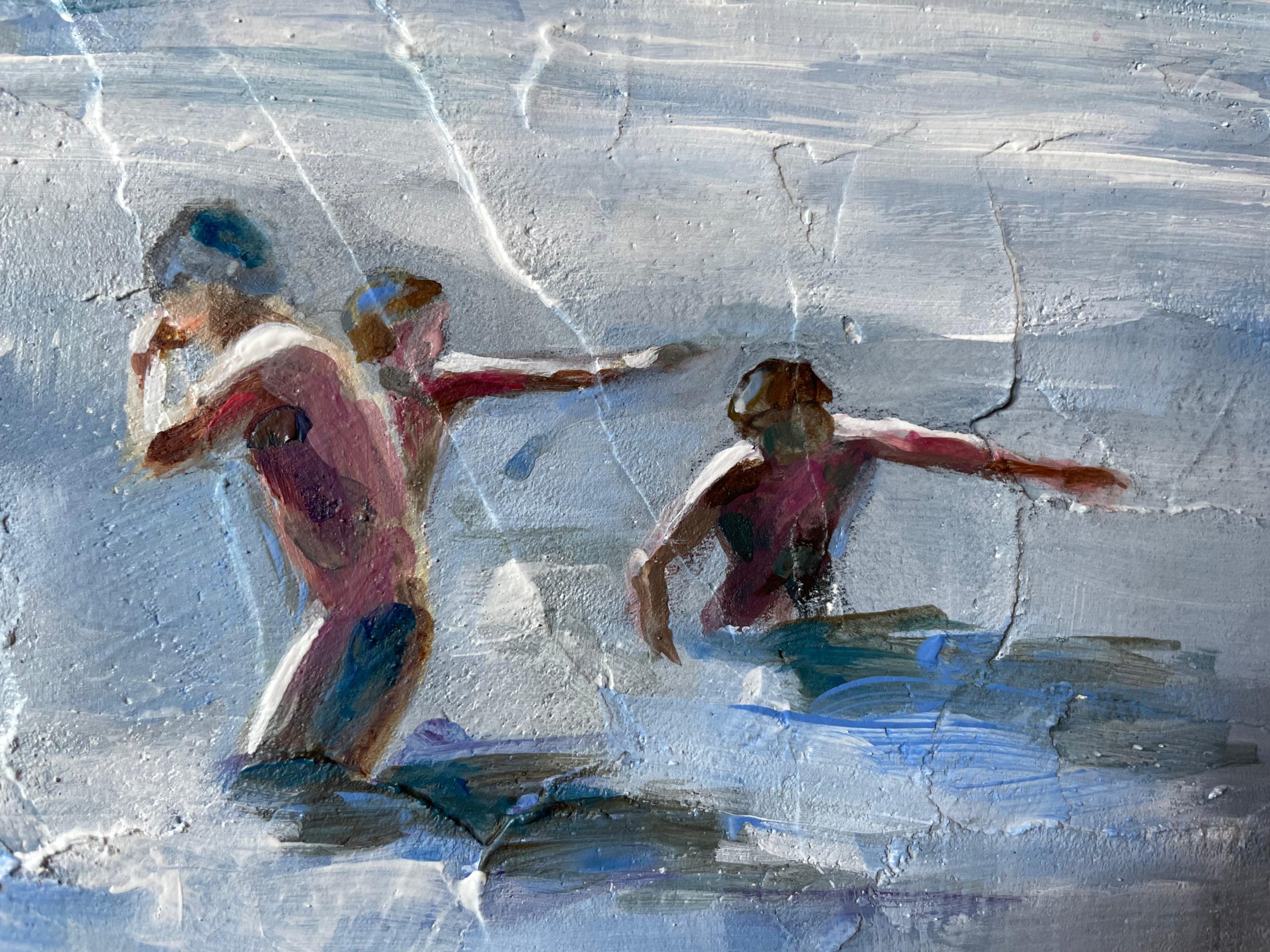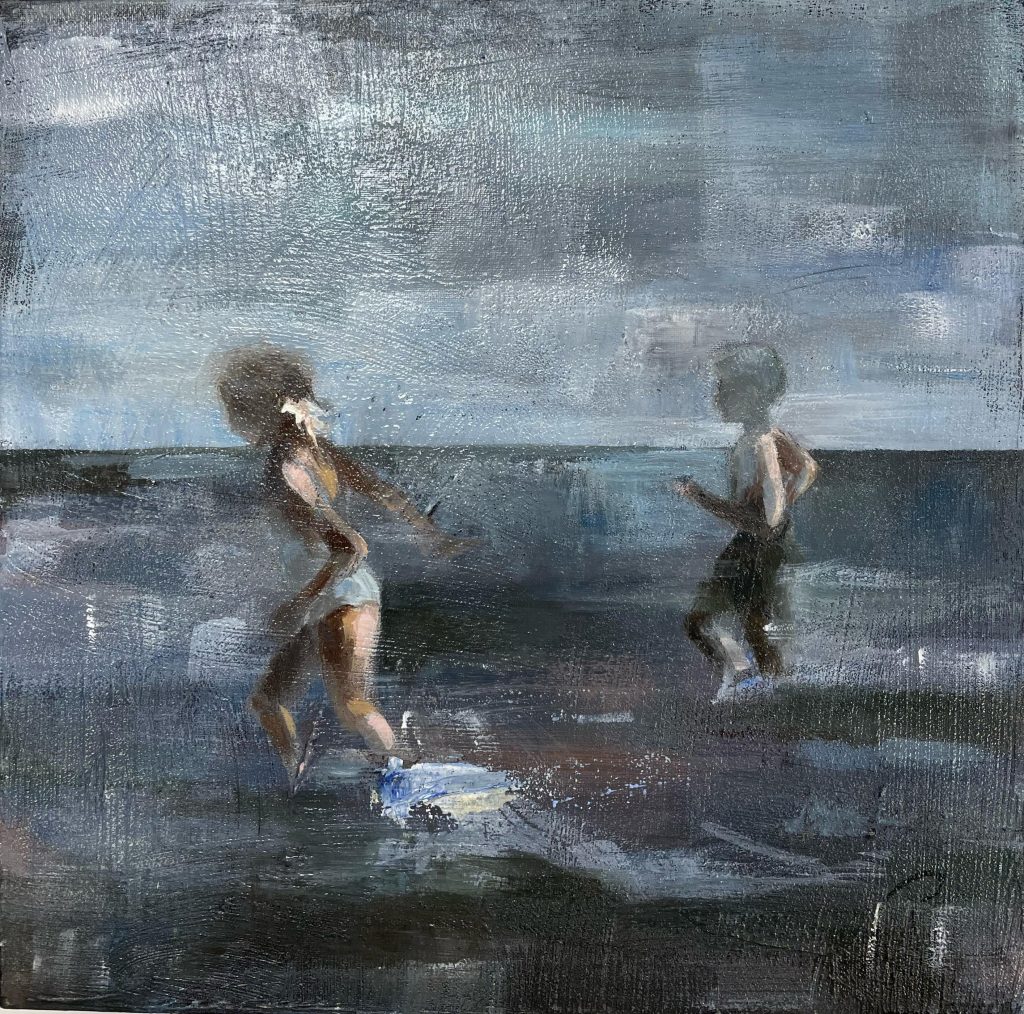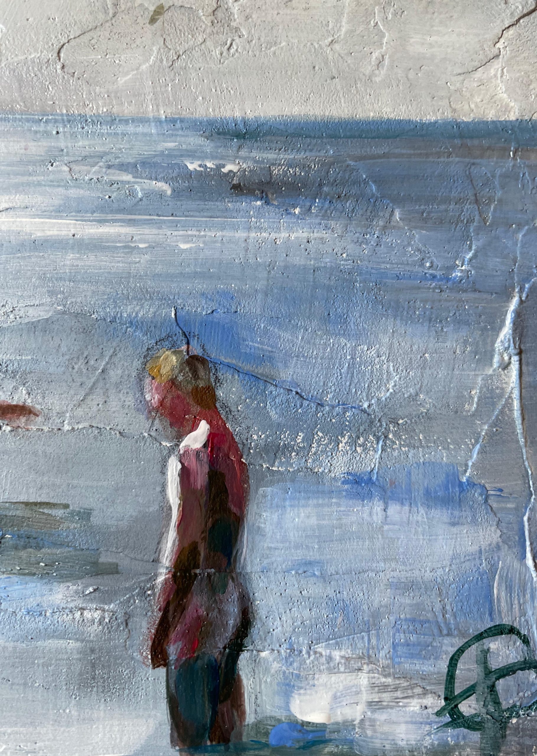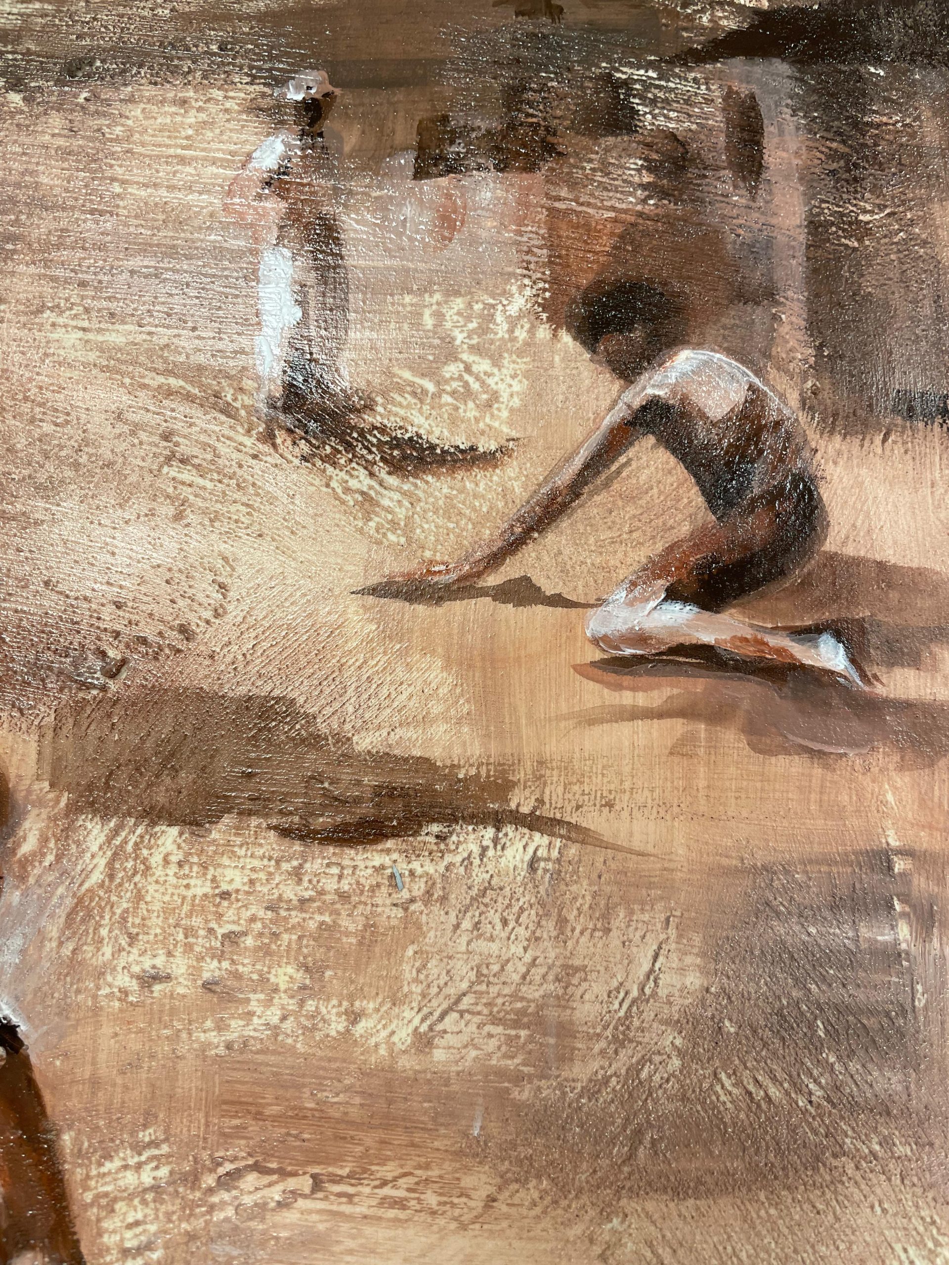 Tutto questo ci rimanda a tempi lontani che hanno una propria armonia intrinseca e che lasciano trasparire modalità espressive che riguardano la gente comune. L’autrice crea con la spatola delle imperfezioni volute che si mischiano agli attimi di spensieratezza evocati e rappresentati in modo peculiare, come i giochi in strada dei bambini o i bagnanti in riva al mare, con una tavolozza scabra e quasi monocroma.
