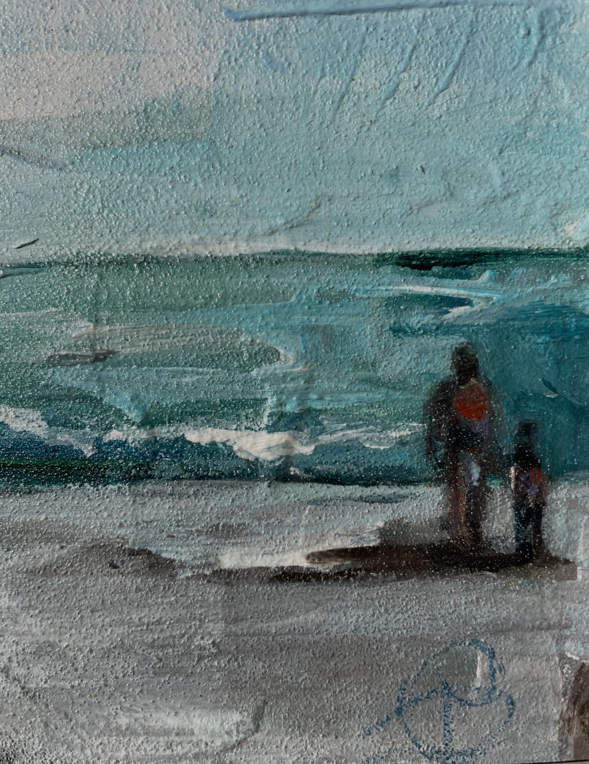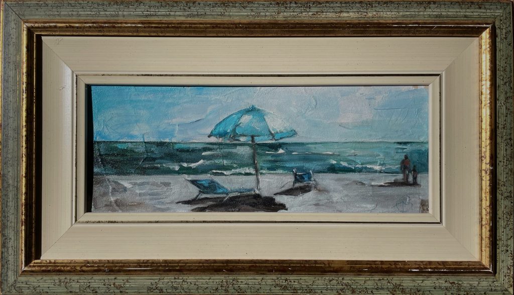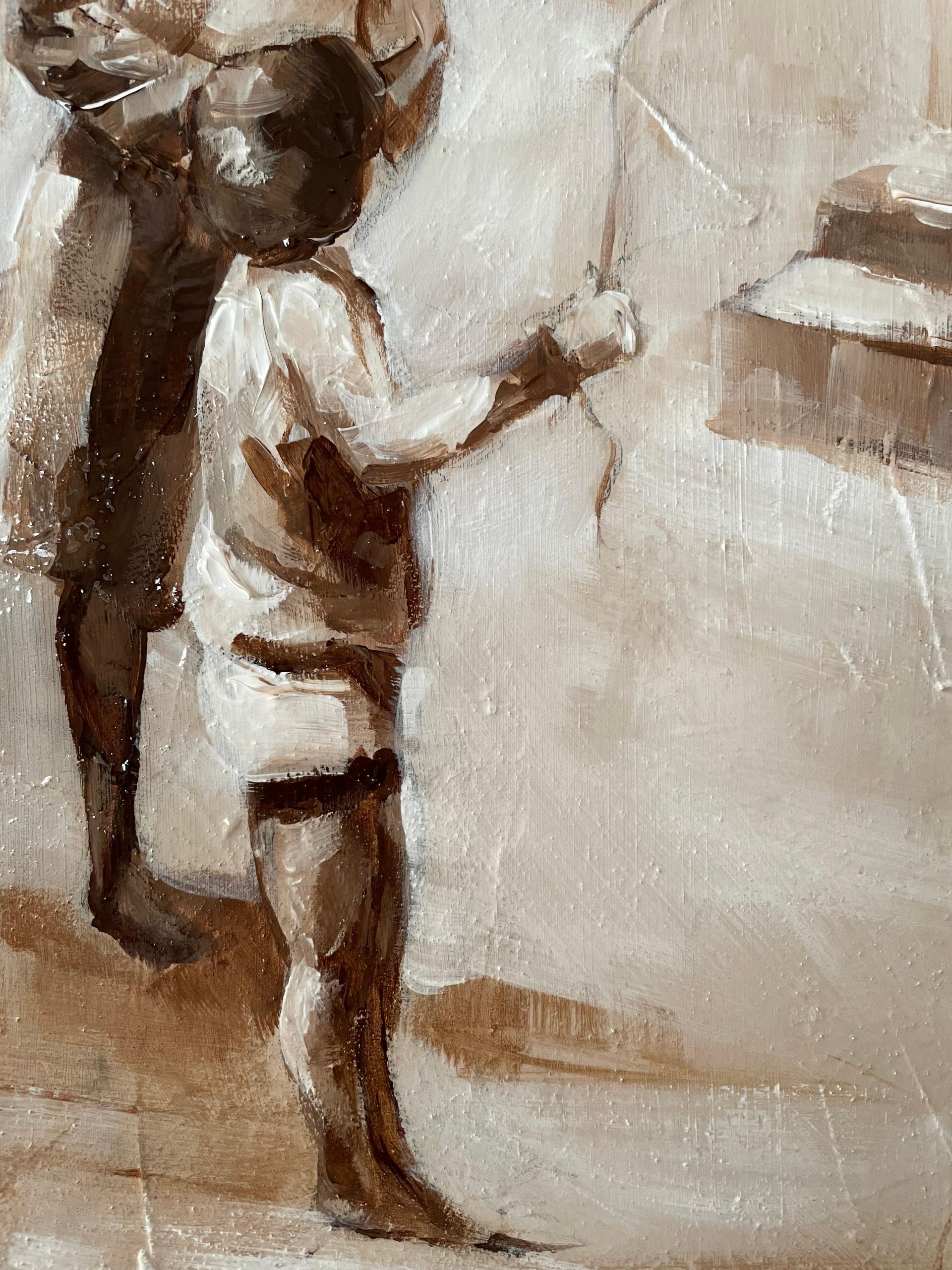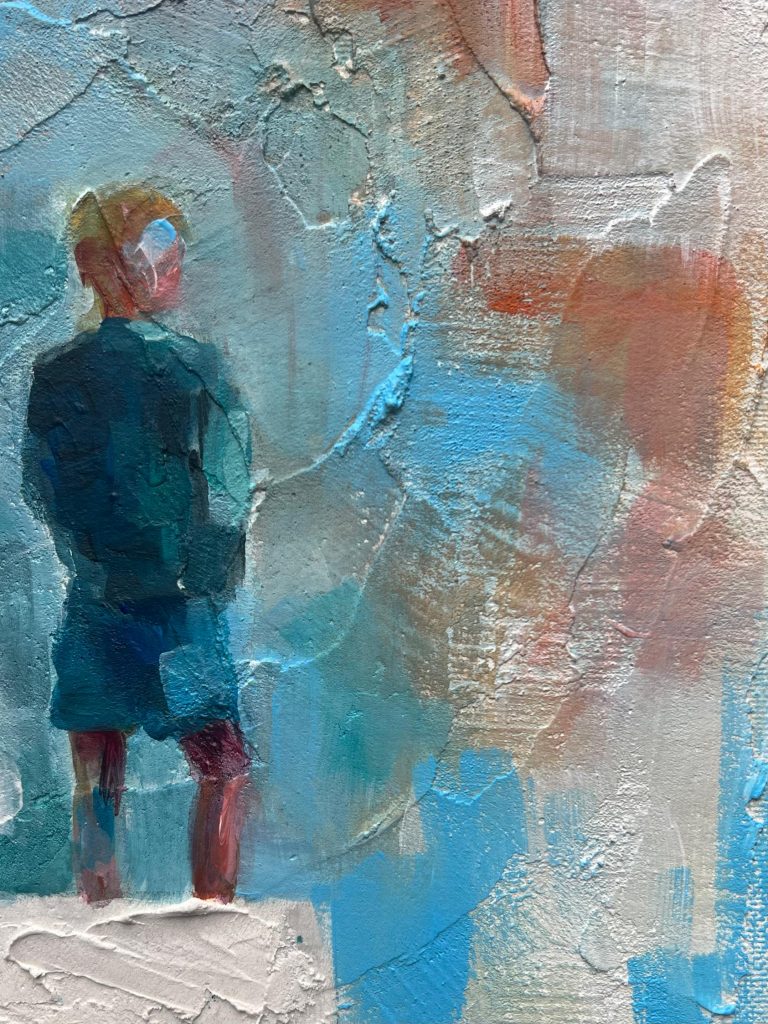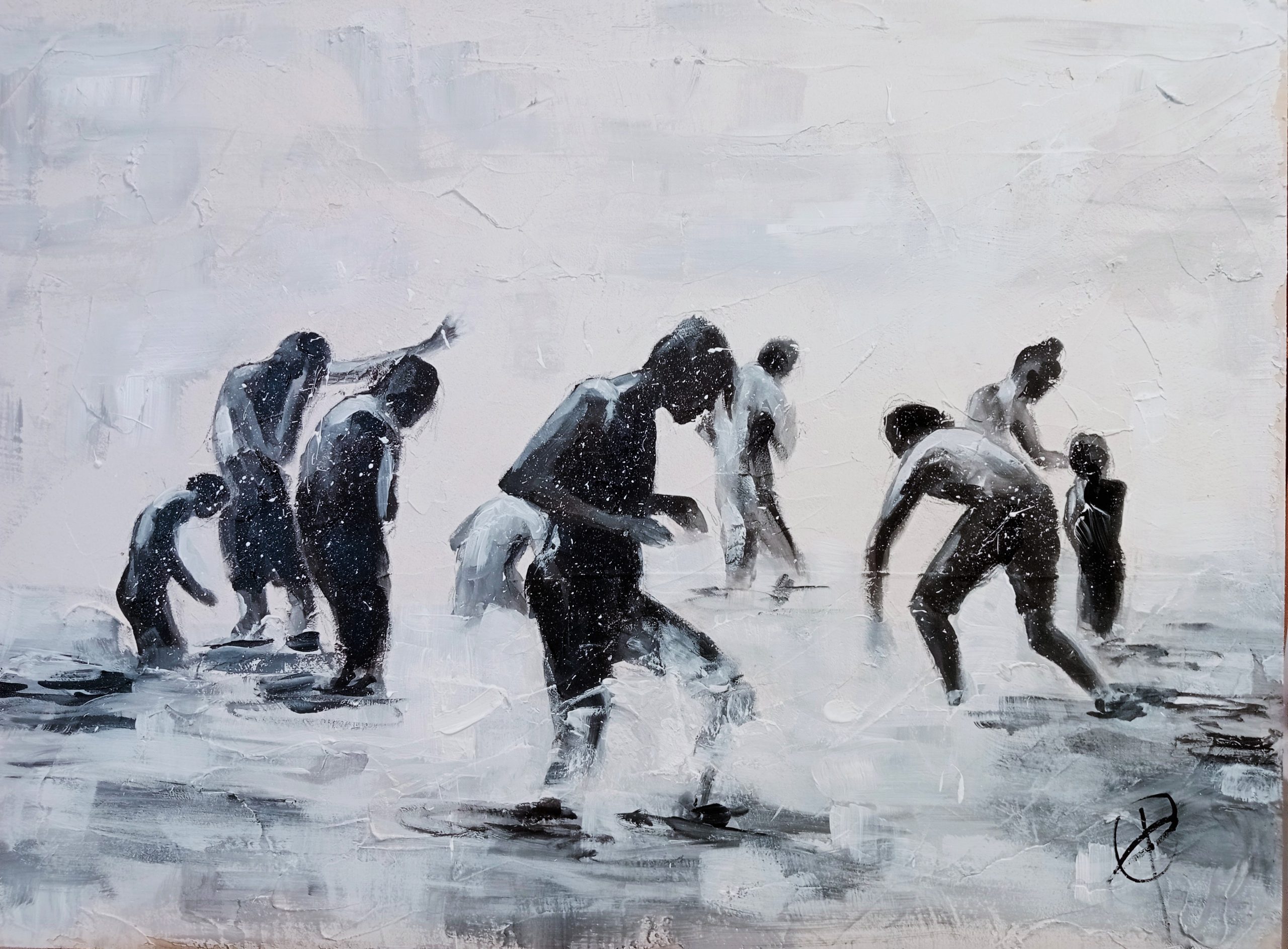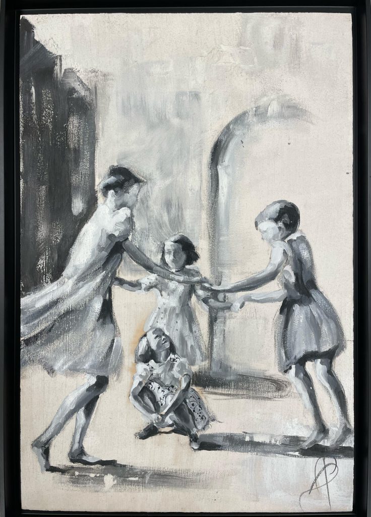 Tutto questo ci rimanda a tempi lontani che hanno una propria armonia intrinseca e che lasciano trasparire modalità espressive che riguardano la gente comune. L’autrice crea con la spatola delle imperfezioni volute che si mischiano agli attimi di spensieratezza evocati e rappresentati in modo peculiare, come i giochi in strada dei bambini o i bagnanti in riva al mare, con una tavolozza scabra e quasi monocroma.
