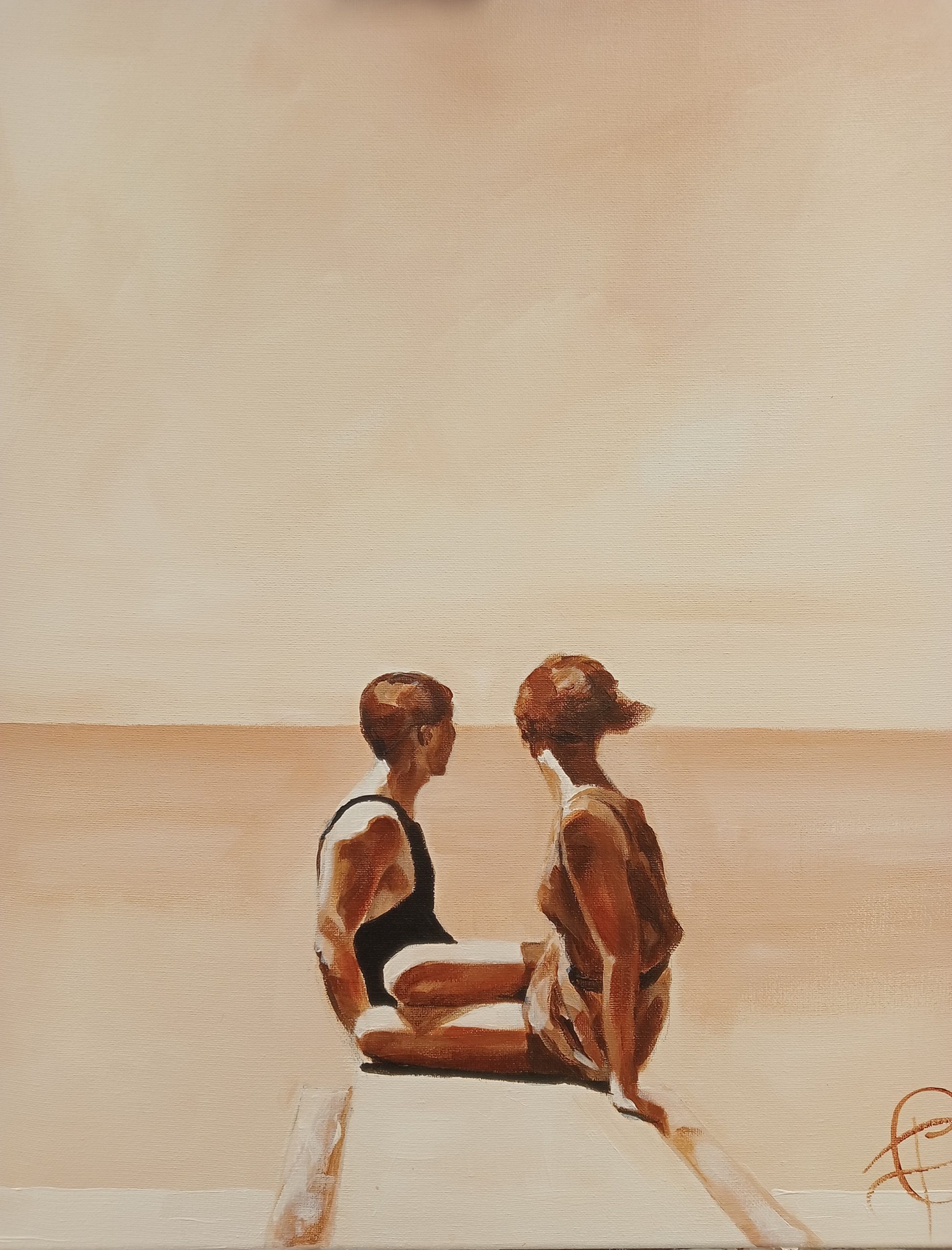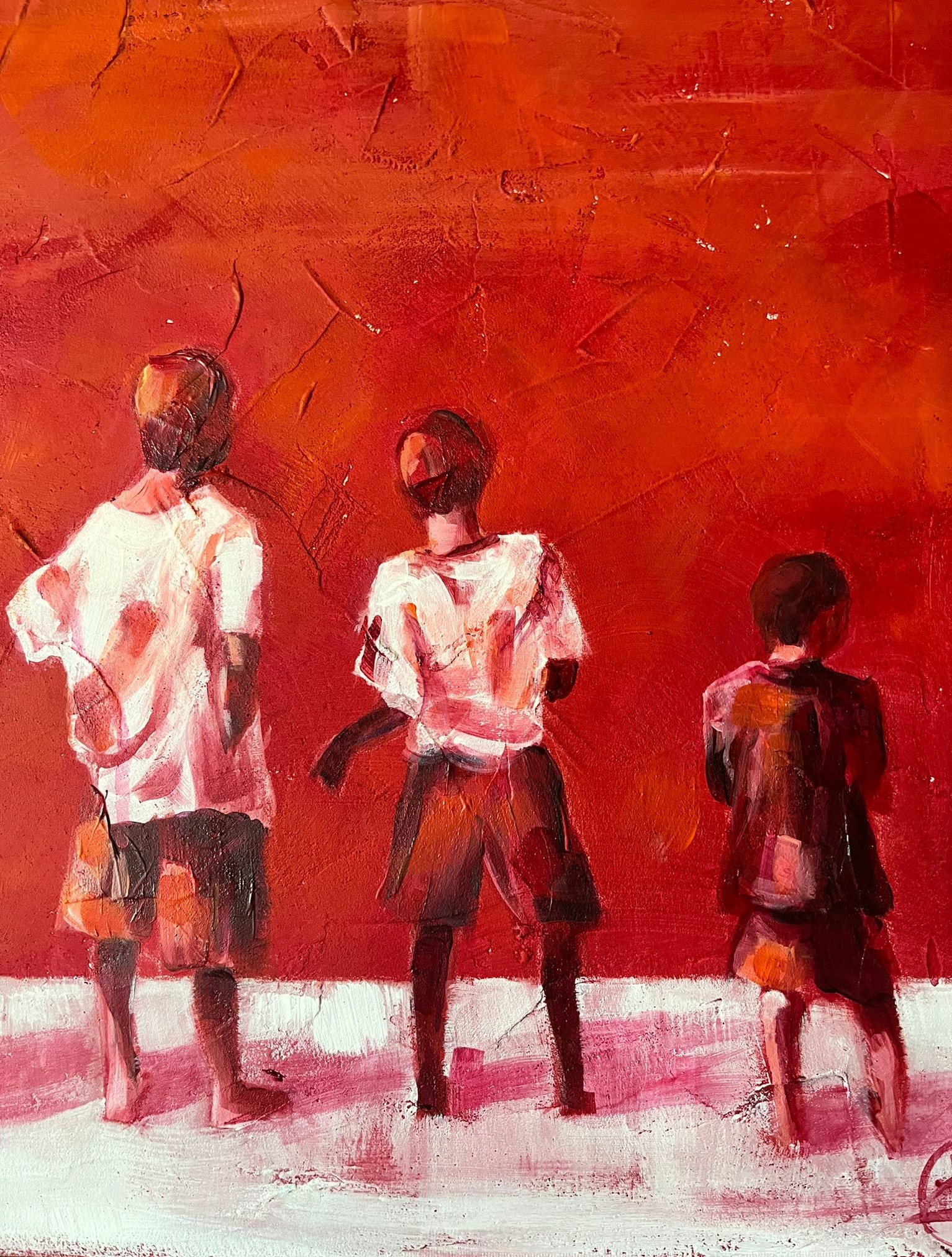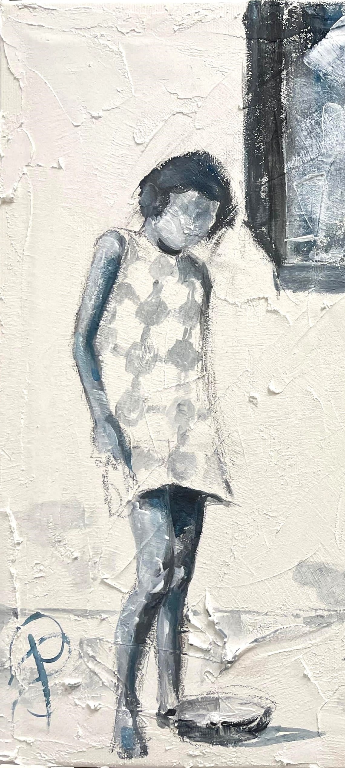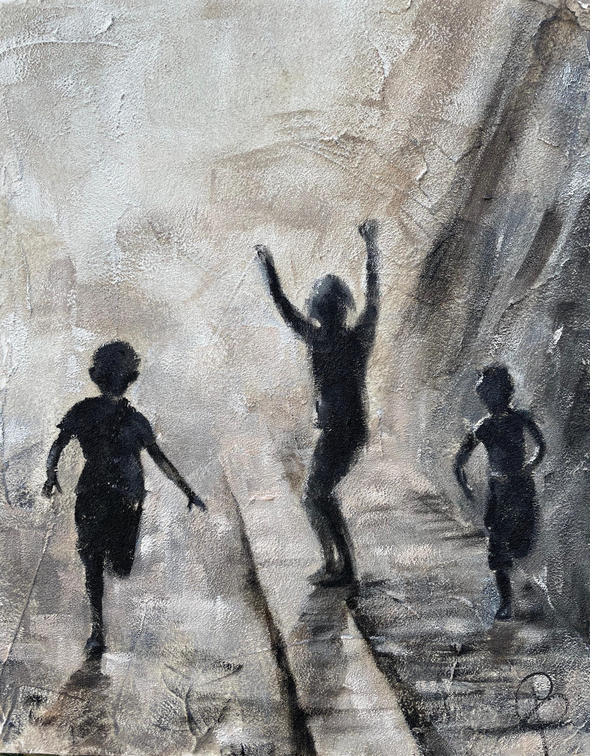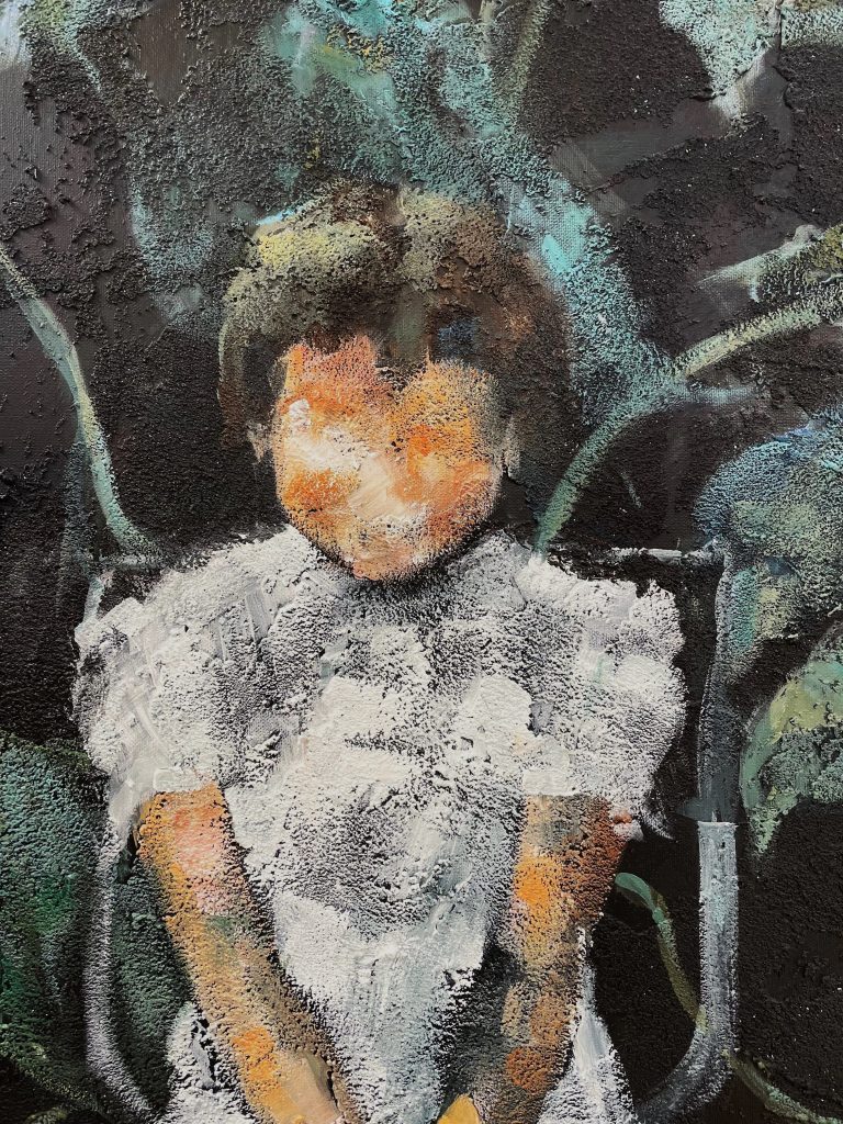 Tutto questo ci rimanda a tempi lontani che hanno una propria armonia intrinseca e che lasciano trasparire modalità espressive che riguardano la gente comune. L’autrice crea con la spatola delle imperfezioni volute che si mischiano agli attimi di spensieratezza evocati e rappresentati in modo peculiare, come i giochi in strada dei bambini o i bagnanti in riva al mare, con una tavolozza scabra e quasi monocroma.
