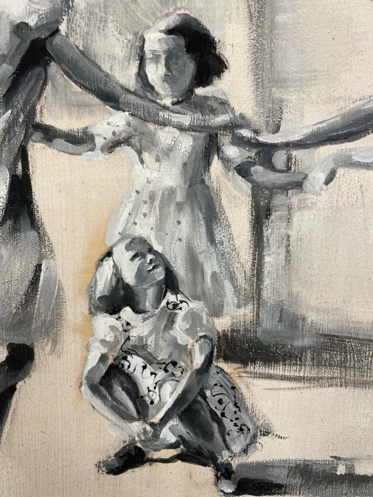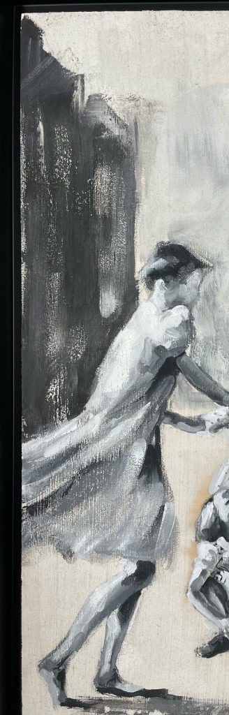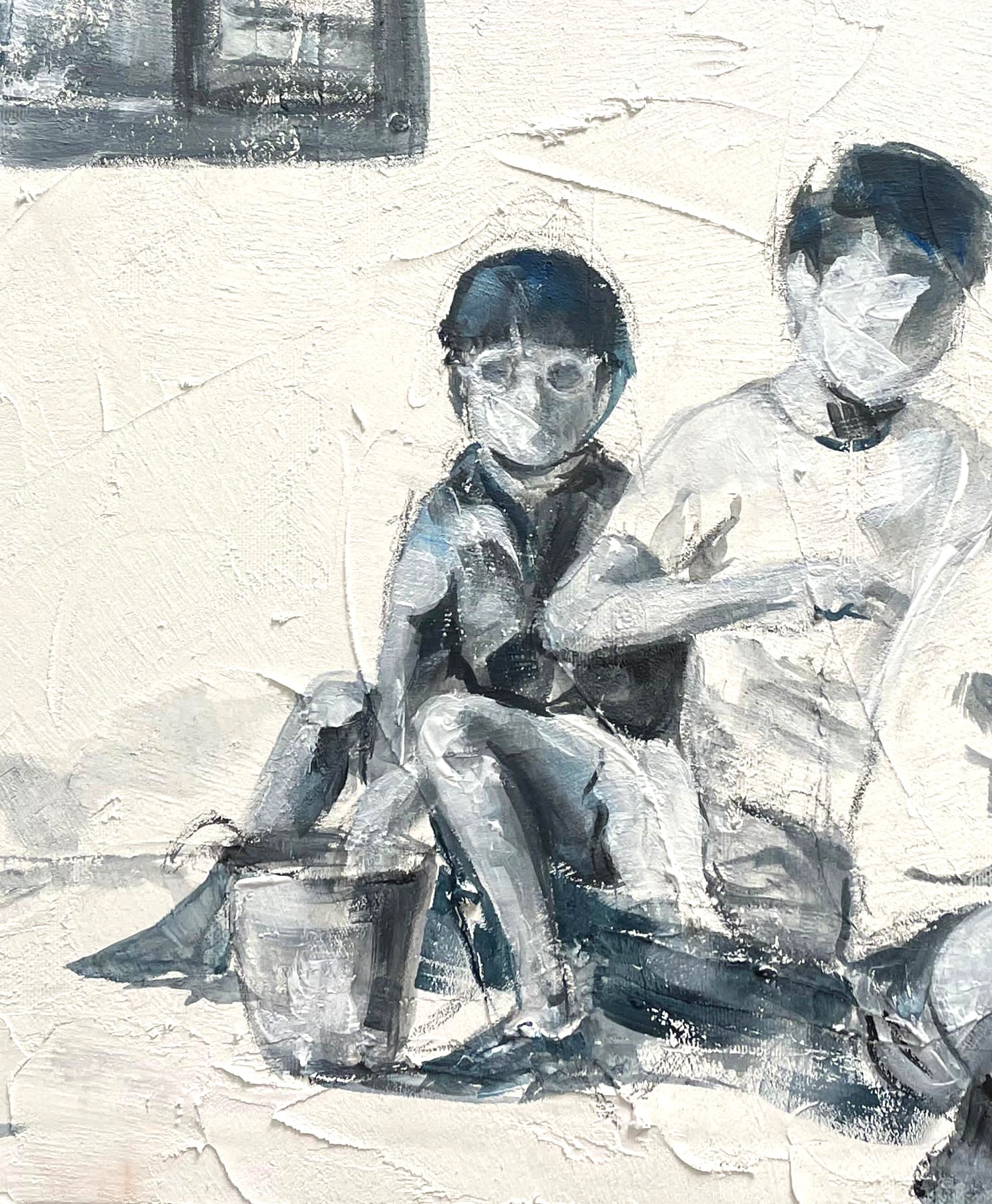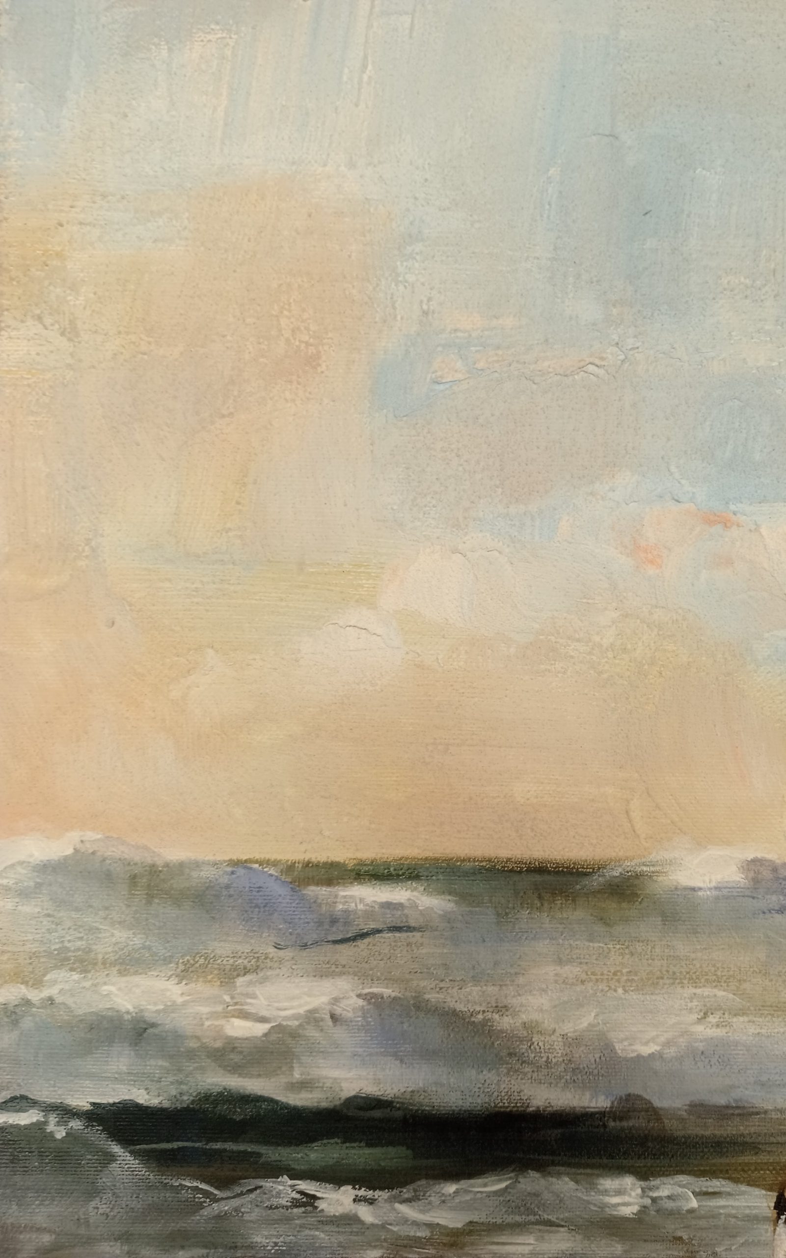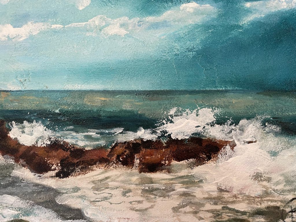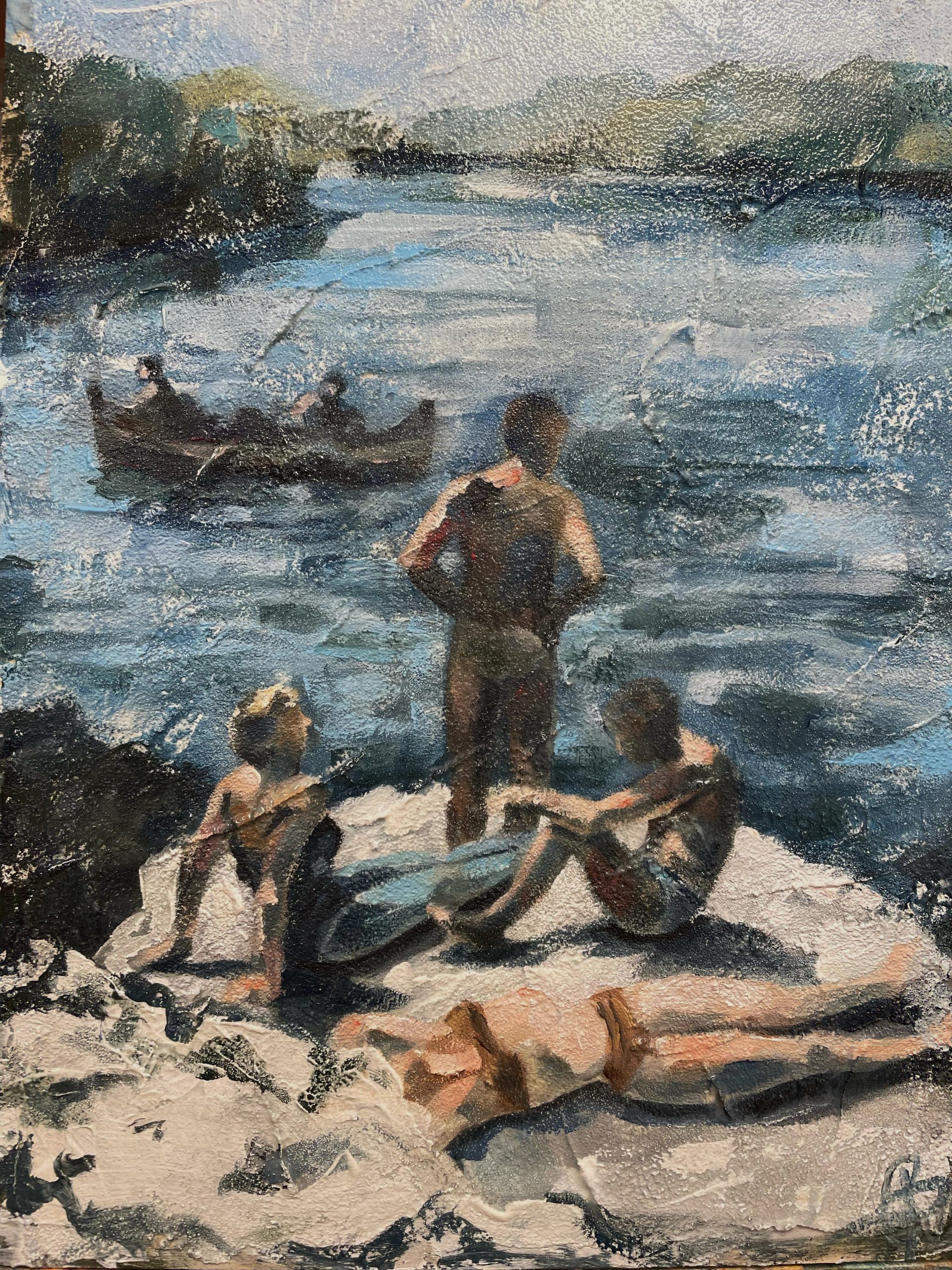 Tutto questo ci rimanda a tempi lontani che hanno una propria armonia intrinseca e che lasciano trasparire modalità espressive che riguardano la gente comune. L’autrice crea con la spatola delle imperfezioni volute che si mischiano agli attimi di spensieratezza evocati e rappresentati in modo peculiare, come i giochi in strada dei bambini o i bagnanti in riva al mare, con una tavolozza scabra e quasi monocroma.