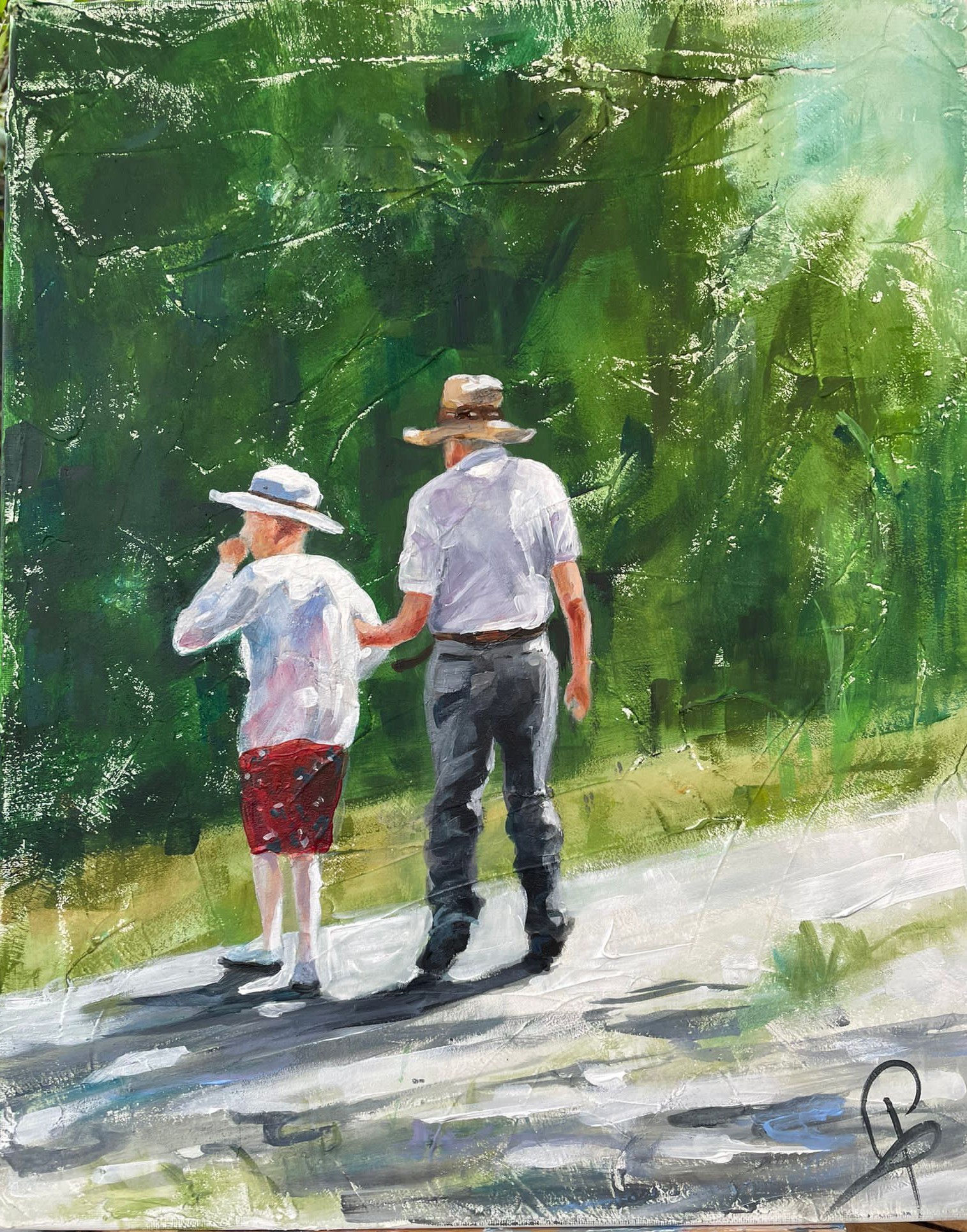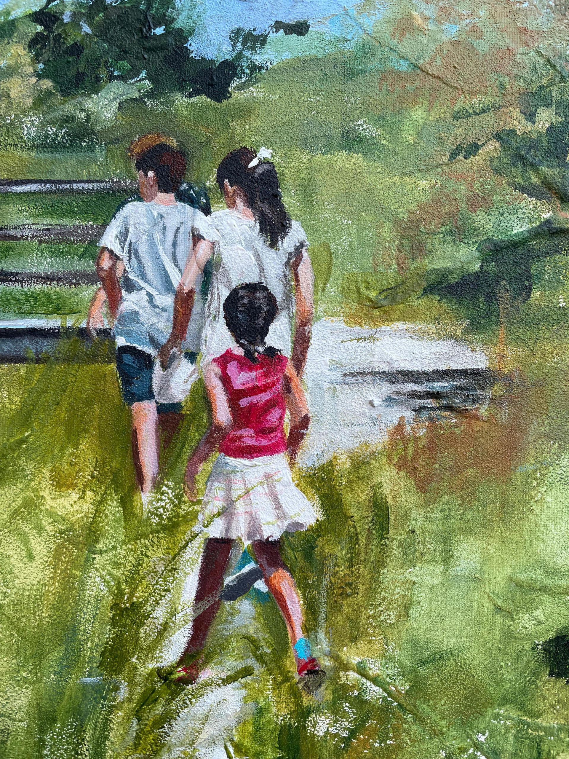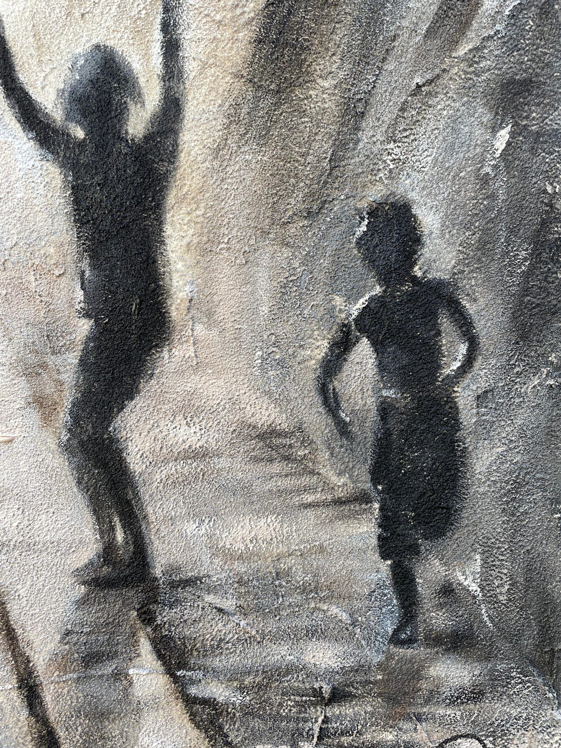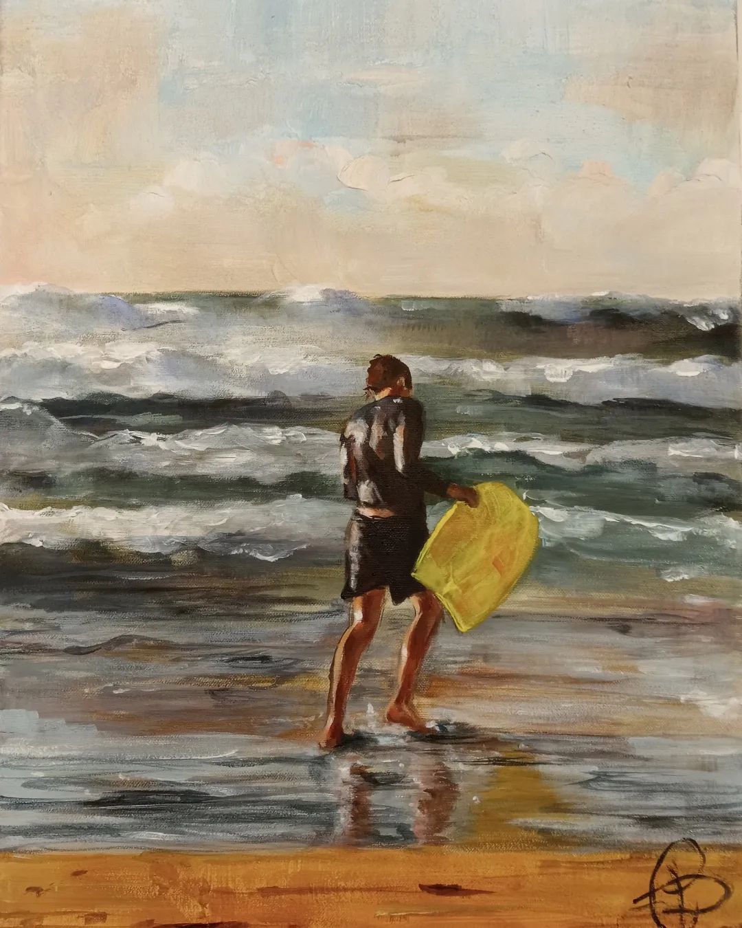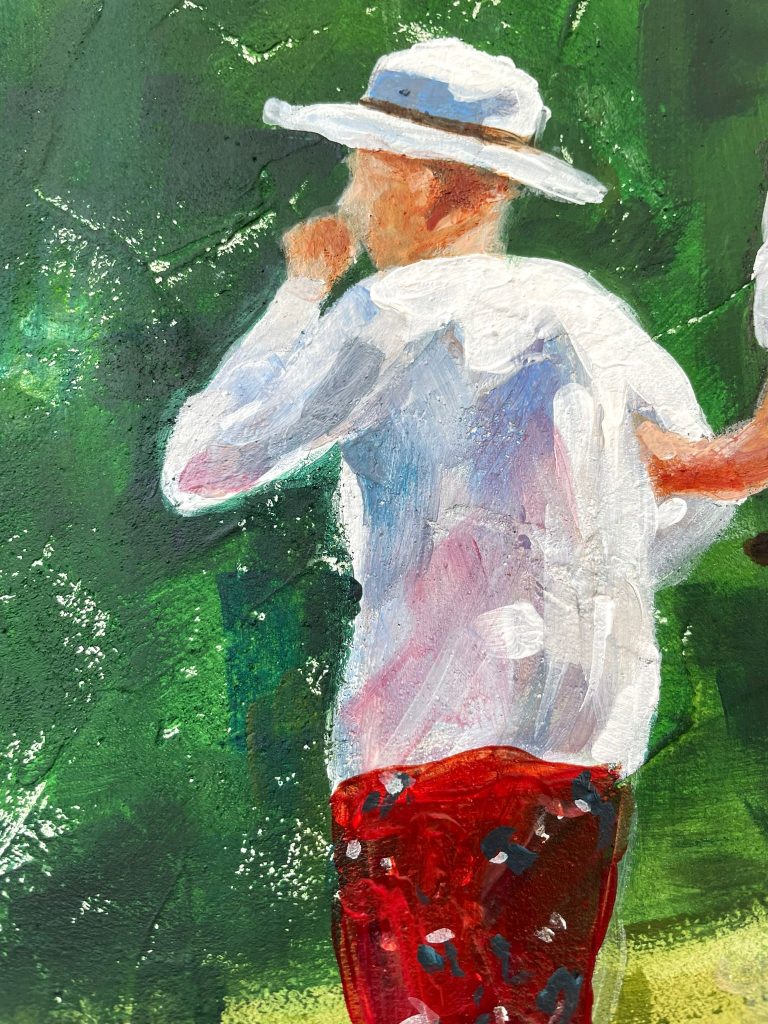 Tutto questo ci rimanda a tempi lontani che hanno una propria armonia intrinseca e che lasciano trasparire modalità espressive che riguardano la gente comune. L’autrice crea con la spatola delle imperfezioni volute che si mischiano agli attimi di spensieratezza evocati e rappresentati in modo peculiare, come i giochi in strada dei bambini o i bagnanti in riva al mare, con una tavolozza scabra e quasi monocroma.